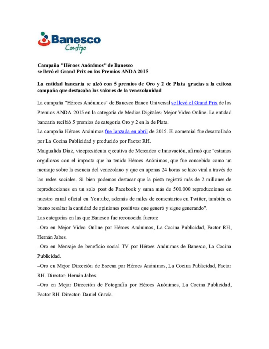 La campaña "Héroes Anónimos" de Banesco Banco Universal se llevó el Grand Prix de los Premios ANDA 2015 en la categoría de Medios Digitales: Mejor Video Online. La entidad bancaria recibió 5 premios de categoría Oro y 2 en la de Plata.