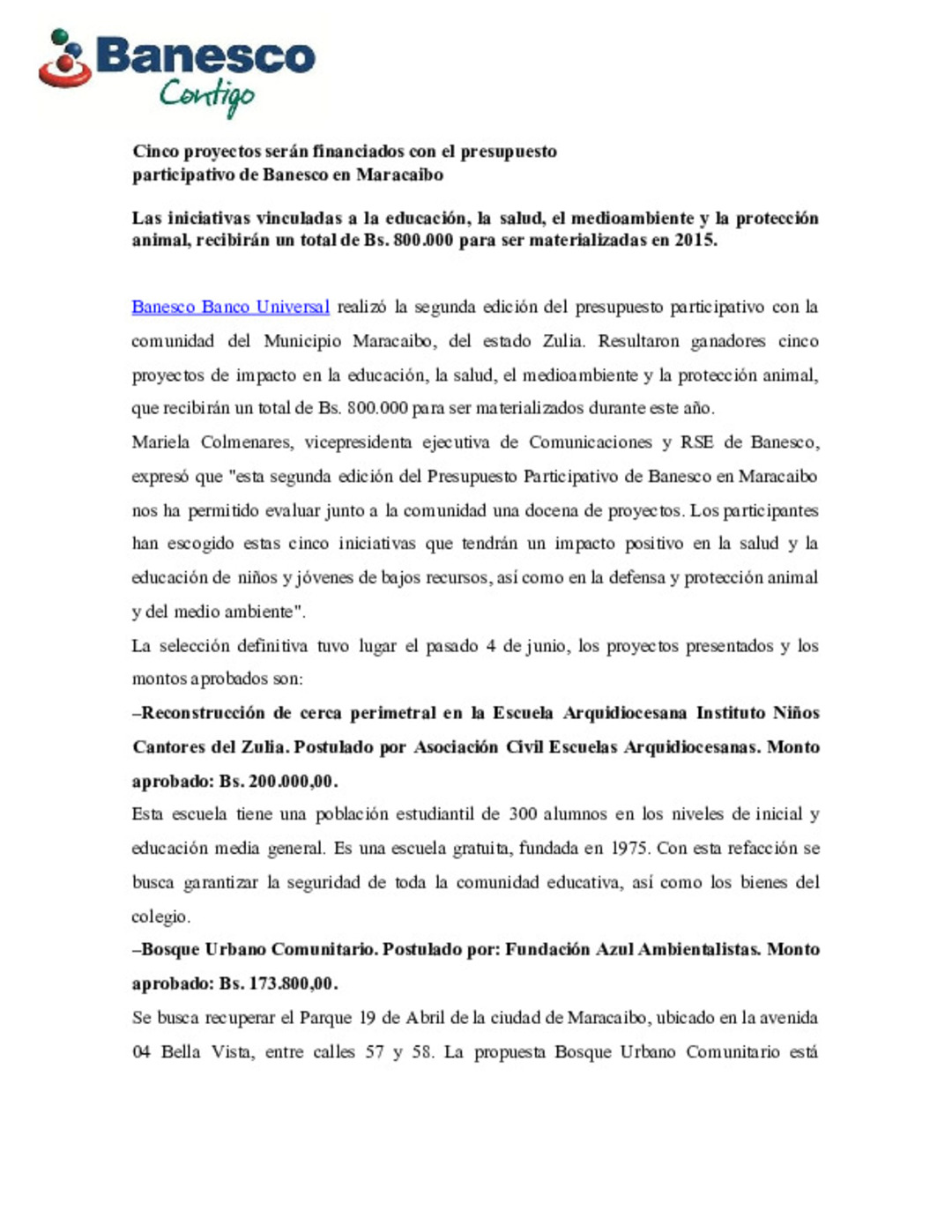 Banesco Banco Universal realizó la segunda edición del presupuesto participativo con la comunidad del Municipio Maracaibo, del estado Zulia. Resultaron ganadores cinco proyectos de impacto en la educación, la salud, el medioambiente y la protección animal, que recibirán un total de Bs. 800.000 para ser materializados durante este año.