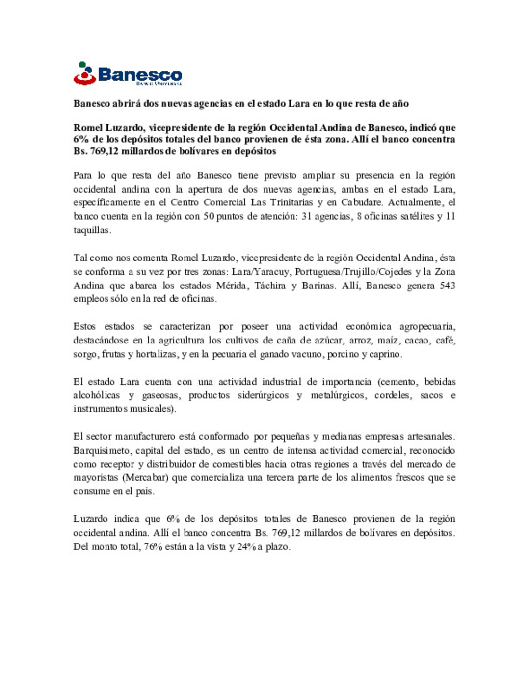 Para lo que resta del año Banesco tiene previsto ampliar su presencia en la región occidental andina con la apertura de dos nuevas agencias, ambas en el estado Lara, específicamente en el Centro Comercial Las Trinitarias y en Cabudare.