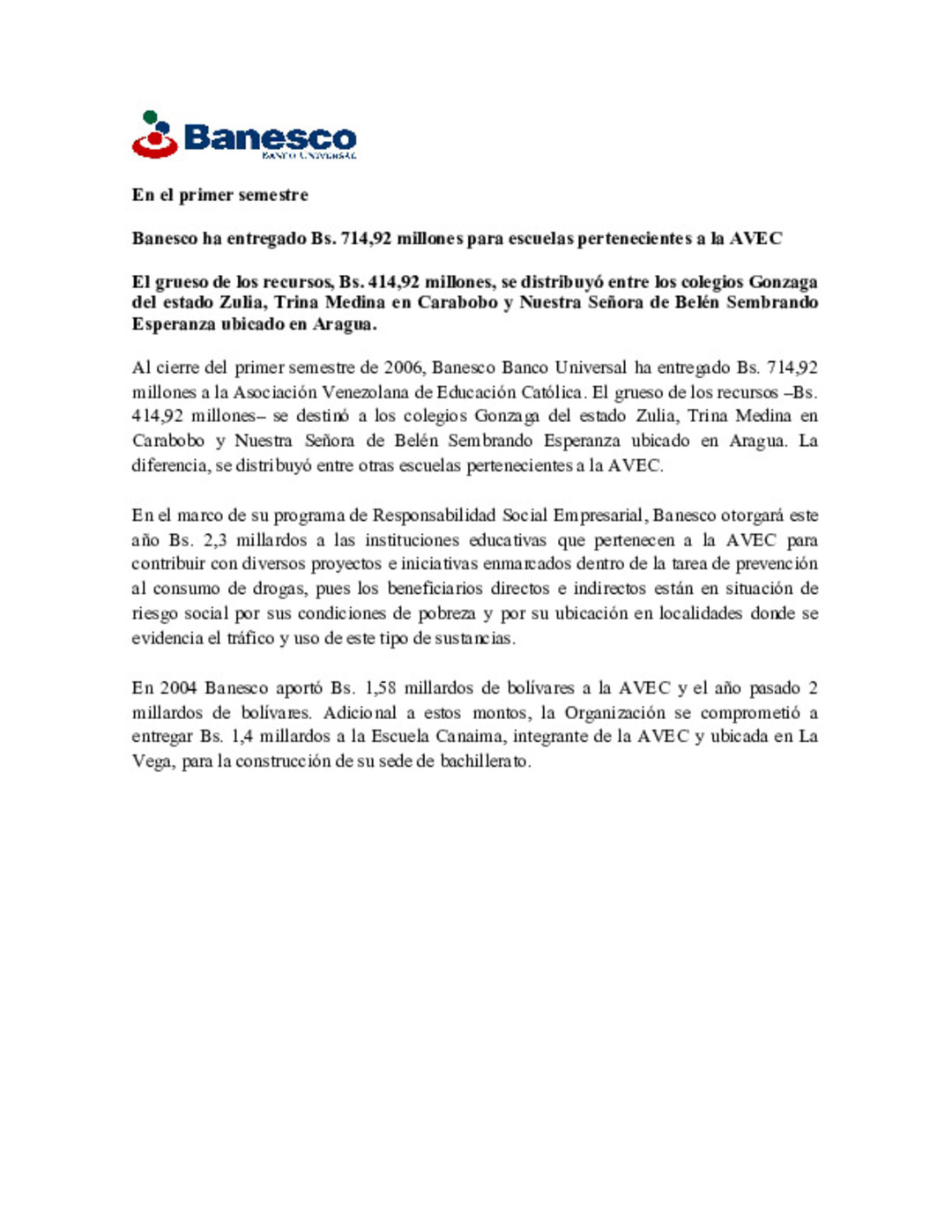 Al cierre del primer semestre de 2006, Banesco Banco Universal ha entregado Bs. 714,92 millones a la Asociación Venezolana de Educación Católica. El grueso de los recursos –Bs. 414,92 millones– se destinó a los colegios Gonzaga del estado Zulia, Trina Medina en Carabobo y Nuestra Señora de Belén Sembrando Esperanza ubicado en Aragua. La diferencia, se distribuyó entre otras escuelas pertenecientes a la AVEC.