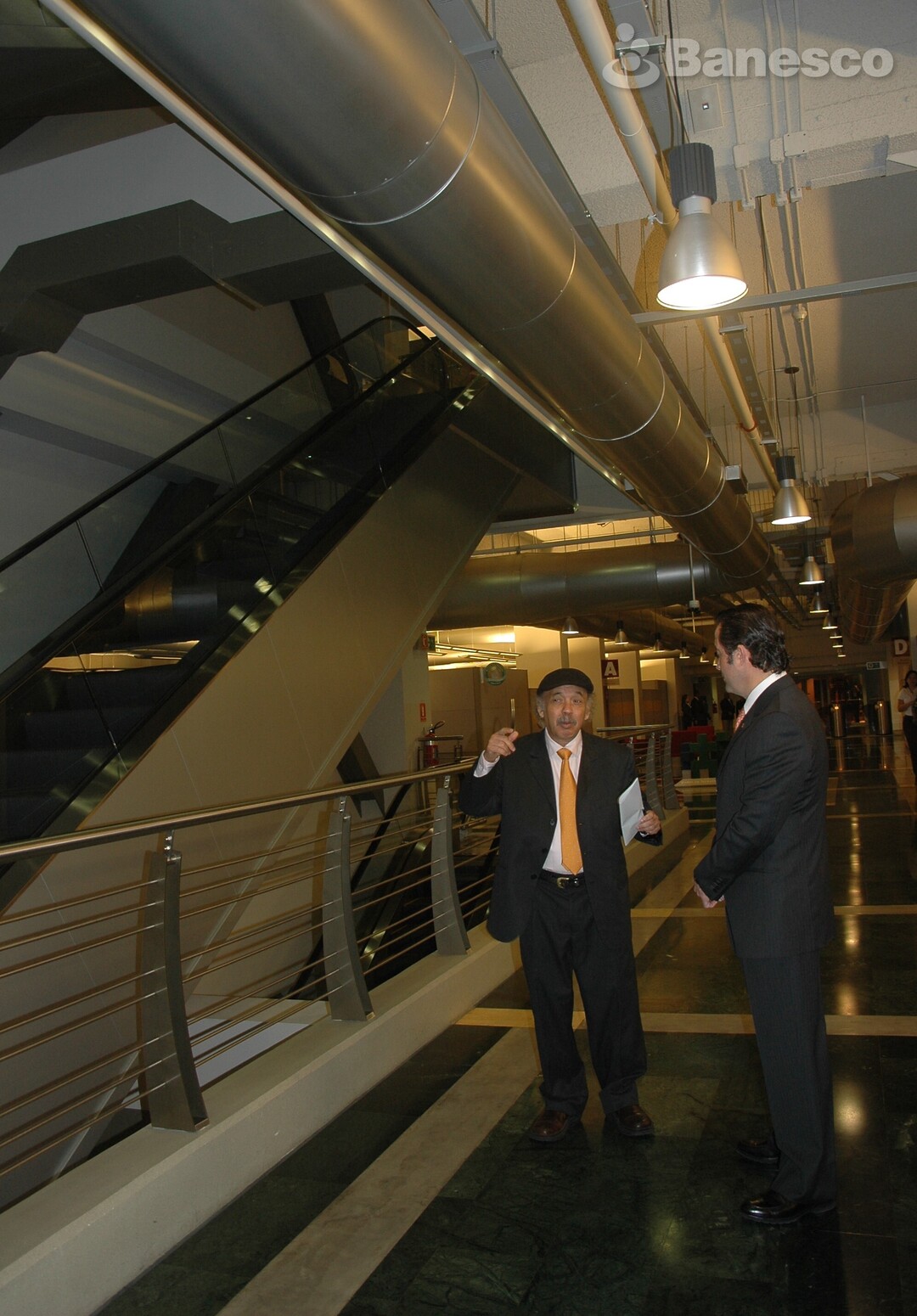 Jacobo Borges y Juan Carlos Escotet recorriendo los pasillos de la institución bancaria antes de la celebración con motivo del bautizo del libro del artista plástico titulado "Jacobo Borges: Del sol o de la luz".