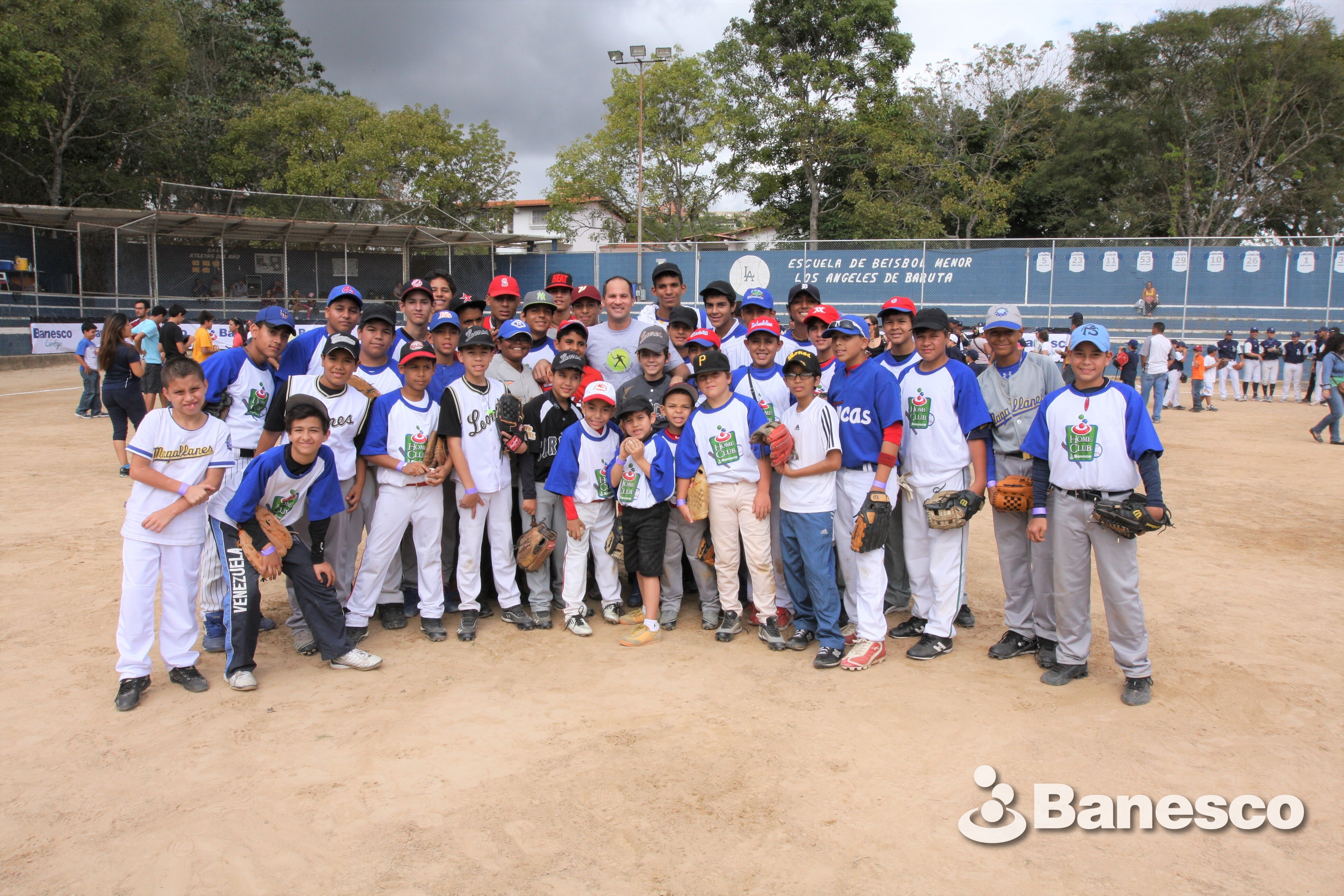 Los integrantes del Home Club Banesco junto al beisbolista venezolano Omar Vizquel en la clínica de béisbol, iniciativa de Banesco Banco Universal para afianzar su responsabilidad social empresarial.