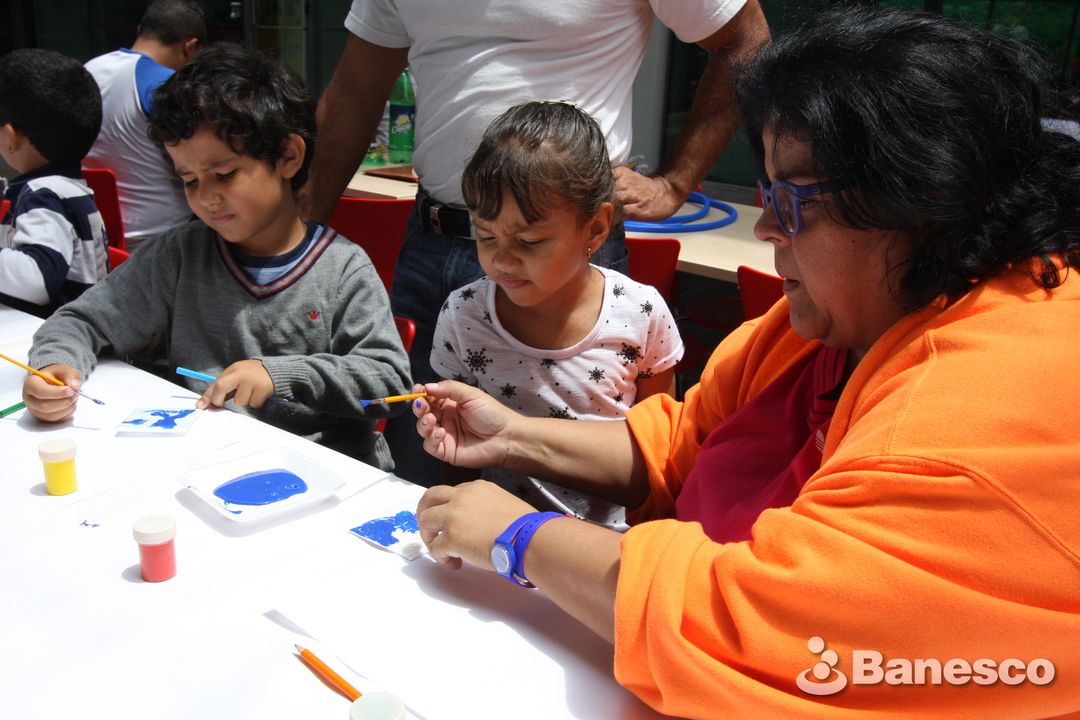 Adriana Barrios, directora de la Fundación Telema, apoyando a los infantes en la creación de manualidades con materiales reciclados, en los espacios de Ciudad Banesco.