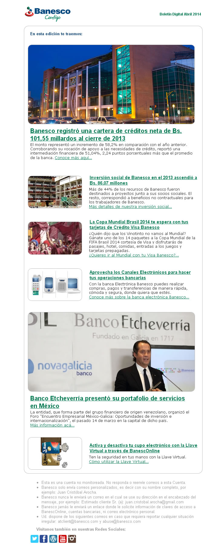El Boletín Digital de abril 2014 contiene la siguiente información: Banesco registró una cartera de créditos neta de Bs. 101,55 millardos al cierre de 2013, Inversión social de Banesco en el 2013 ascendió a Bs. 86,07 millones, La Copa Mundial Brasil 2014 te espera con tus tarjetas de Crédito Visa Banesco, Aprovecha tus canales electrónicos para hacer tus operaciones bancarias.