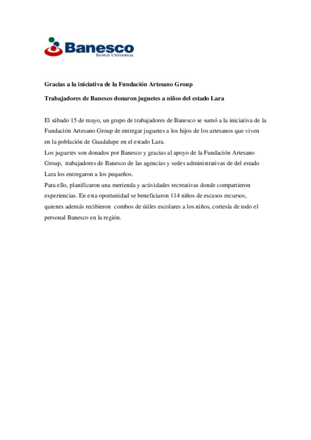El sábado 15 de mayo, un grupo de trabajadores de Banesco se sumó a la iniciativa de la Fundación Artesano Group de entregar juguetes a los hijos de los artesanos que viven en la población de Guadalupe en el estado Lara.