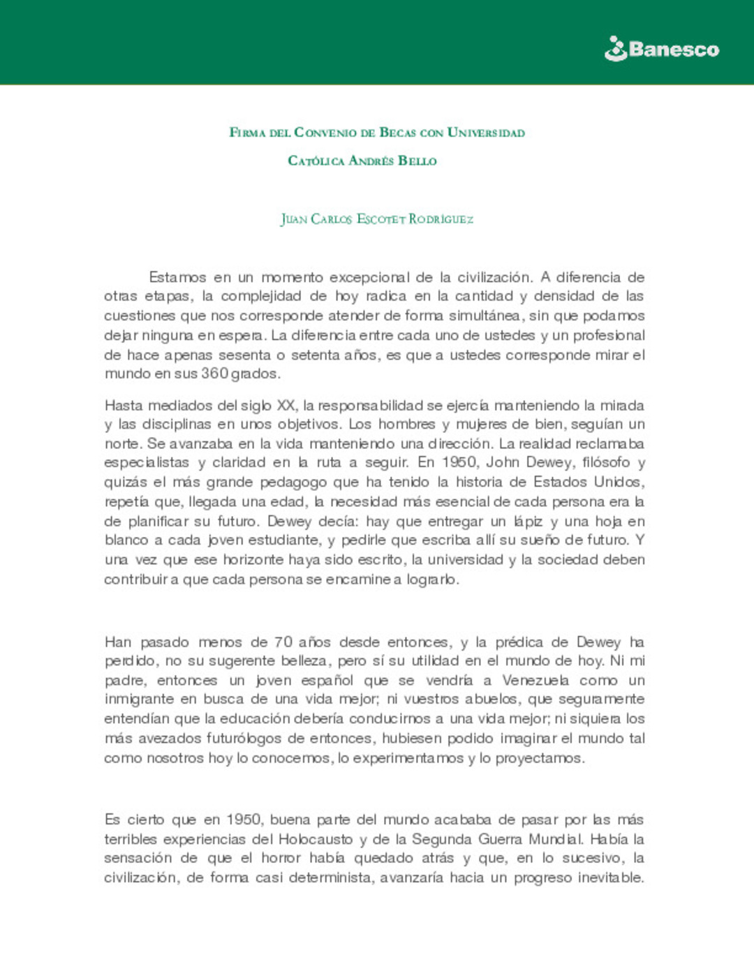 Palabras brindadas por el presidente de Banesco Banco Universal, para el día de la firma del convenio de becas que se estableció con la Universidad Católica Andrés Bello.