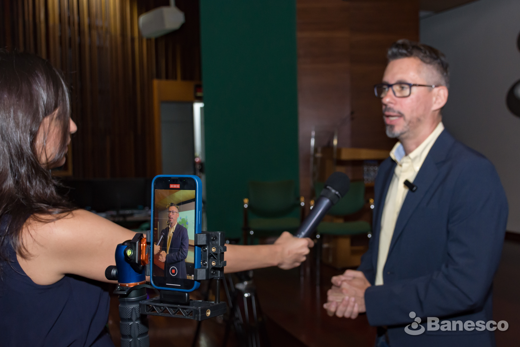 La gerente de Comunicaciones Externas, Valeria Foi, entrevista al doctor en Ciencias Empresariales, Aramis Rodríguez, durante el aniversario 15 del Programa de Formación de Microempresarios.
