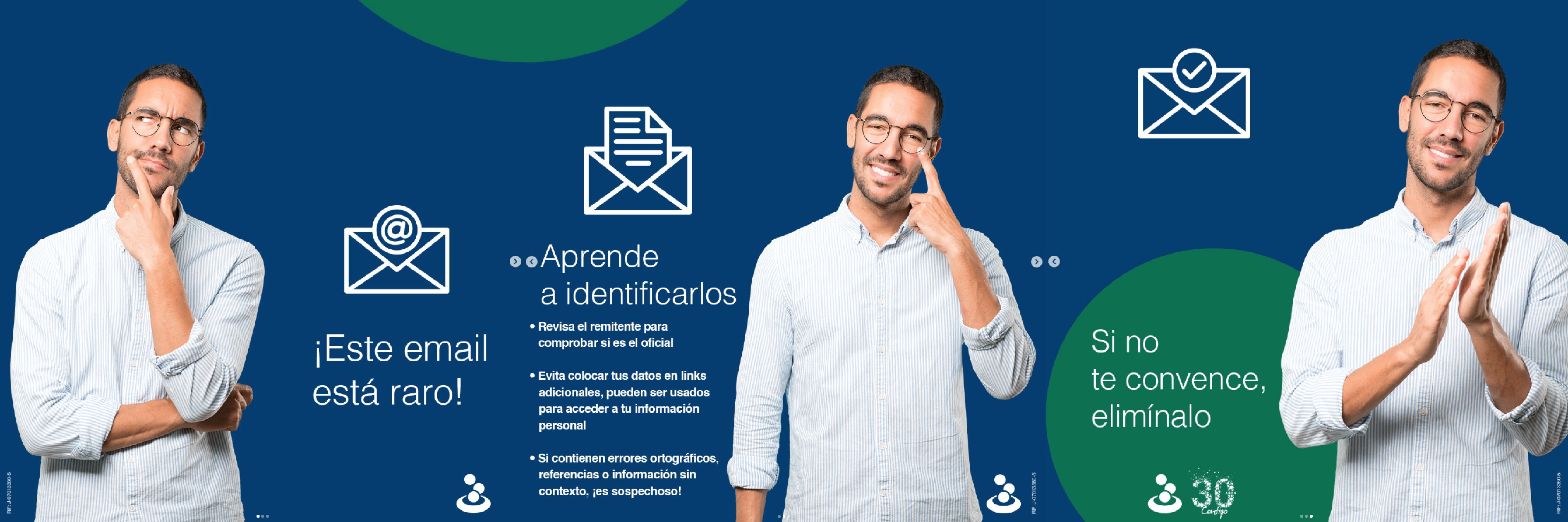 Cuando veas algo extraño en un email ¡Sal de ahí! Desliza para descubrir las señales más fáciles de identificar en un correo fraudulento. ¡Resguarda tus Datos Sensibles!