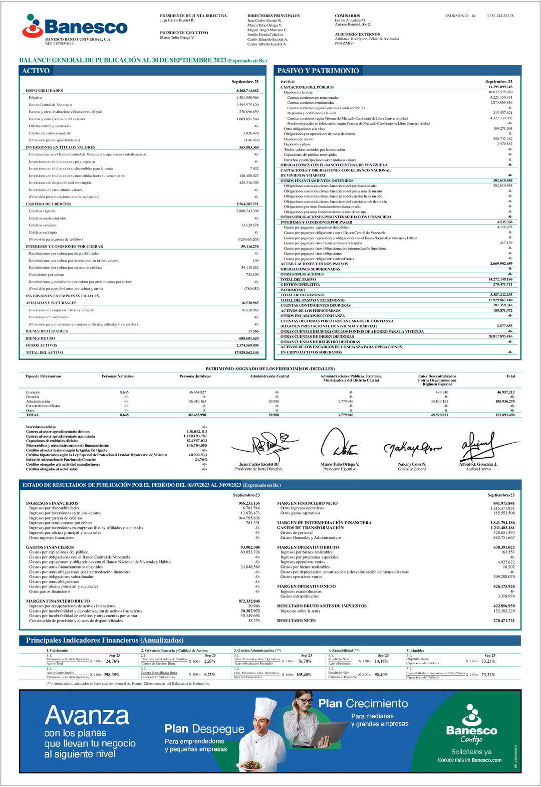 Para una entidad financiera demostrar sus Estados Financieros es un instrumento de suma importancia, ya que refleja todos los movimientos económicos por periodos. A continuación se presenta el Balance General de Publicación al 30 de septiembre de 2023.