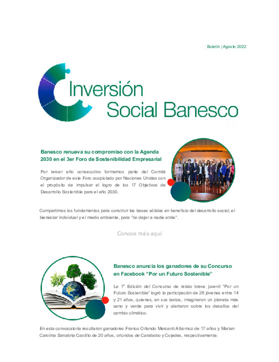 Boletín de RSE para clientes de Banesco Banco Universal que contiene: Banesco renueva su compromiso con la Agenda 2030 en el 3er Foro de Sostenibilidad Empresarial/ Banesco anuncia los ganadores de su Concurso en Facebook “Por un Futuro Sostenible”/ La Biblioteca Digital Banesco llega a las escuelas de AVEC/ Exposición de Jesús Guerrero recaudará fondos para Fundana y SenosAyuda.