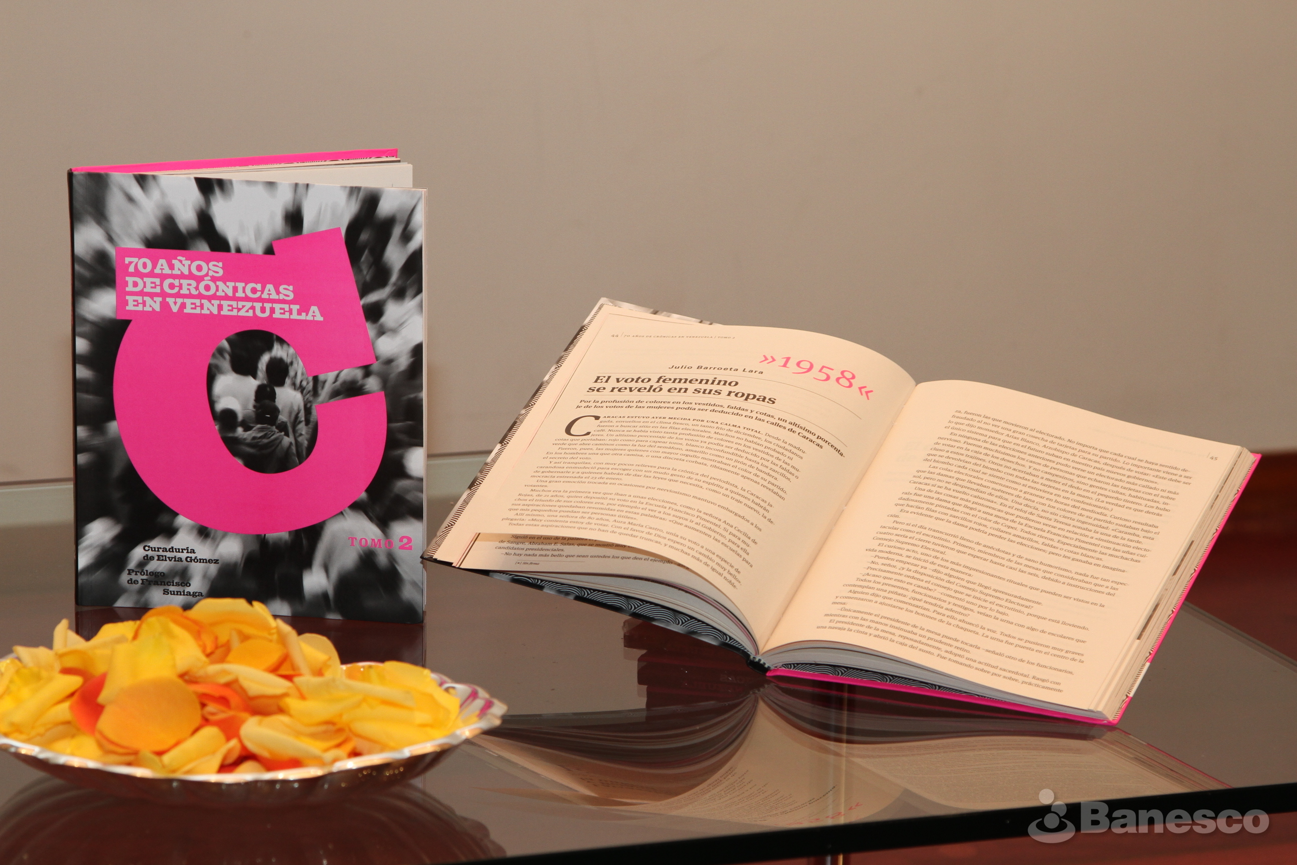 Representación física del libro “70 años de Crónicas en Venezuela”-Tomo 2, el cual se utilizó en el acto protocolar al momento del bautizo con los pétalos de rosas.
