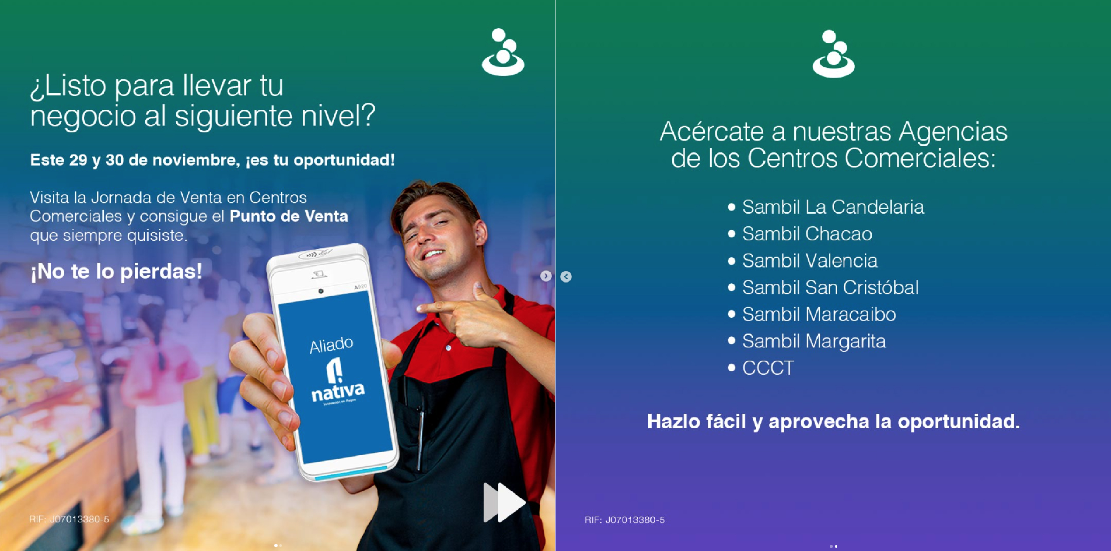 Junto a nuestro aliado @nativapagos te esperamos el viernes 29 y sábado 30 de noviembre en las agencias de los Centros Comerciales: Sambil La Candelaria, Sambil Chacao, Sambil Valencia, Sambil San Cristóbal, Sambil Maracaibo, Sambil Margarita y CCCT. Conoce la variedad de equipos con el mejor precio y con entrega inmediata.