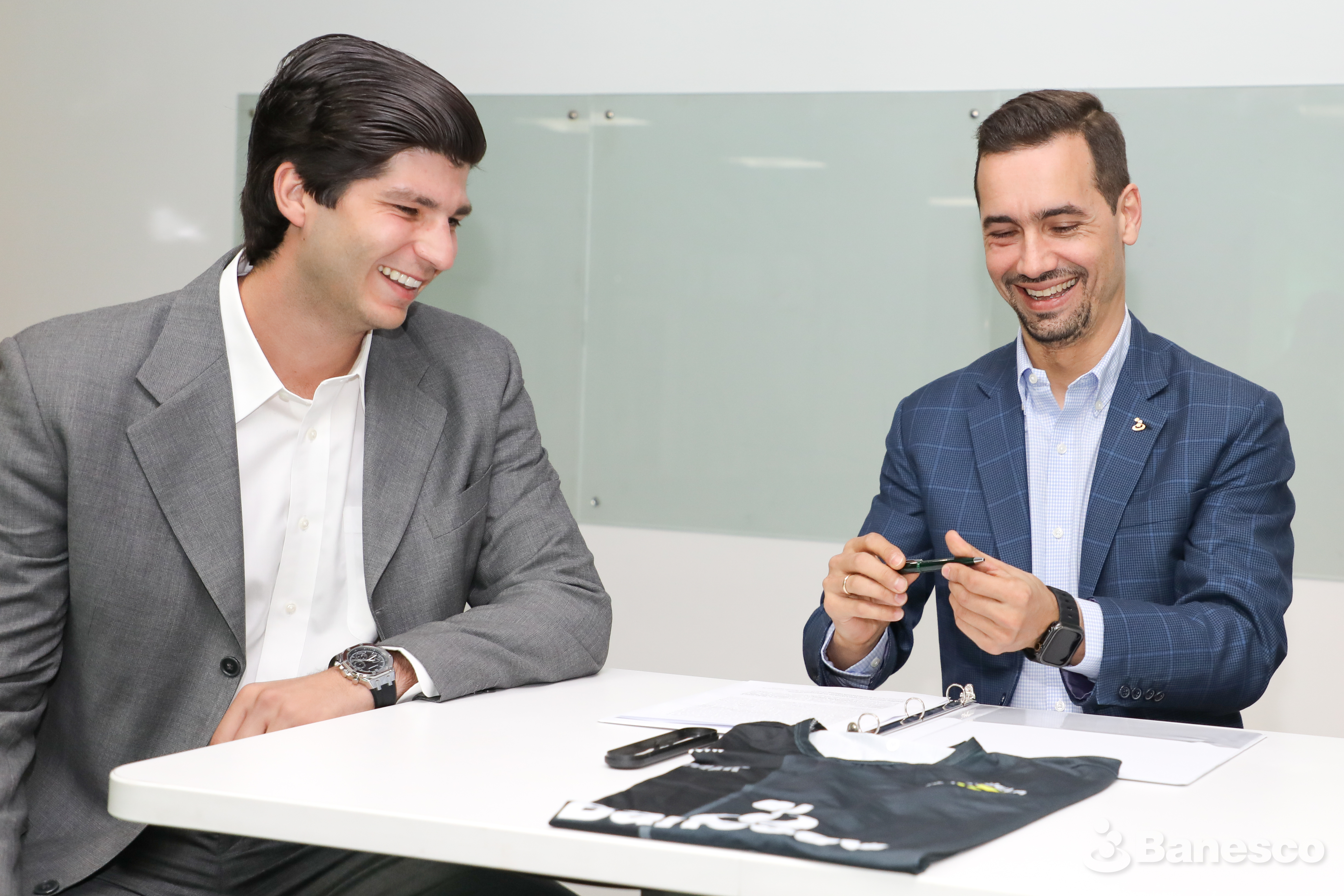 Juan Andrés Pérez, uno de los creadores del Venezuela Pádel Tour junto a Daniel Godoy, vicepresidente de Mercadeo y Productos de Banesco, durante la firma del documento que renueva la alianza entre ambas instituciones.