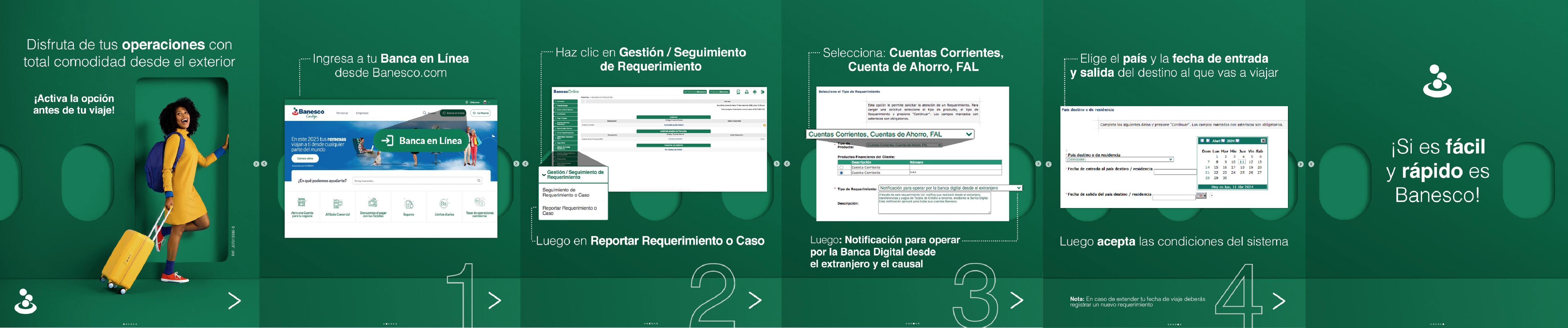 Recuerda notificar tu viaje al exterior en Banesco para continuar disfrutando de tu banca digital sin interrupciones, estés donde estés. Sigue los pasos y registra el requerimiento de «Notificación para operar por la Banca Digital desde el extranjero» en BanescOnline.
