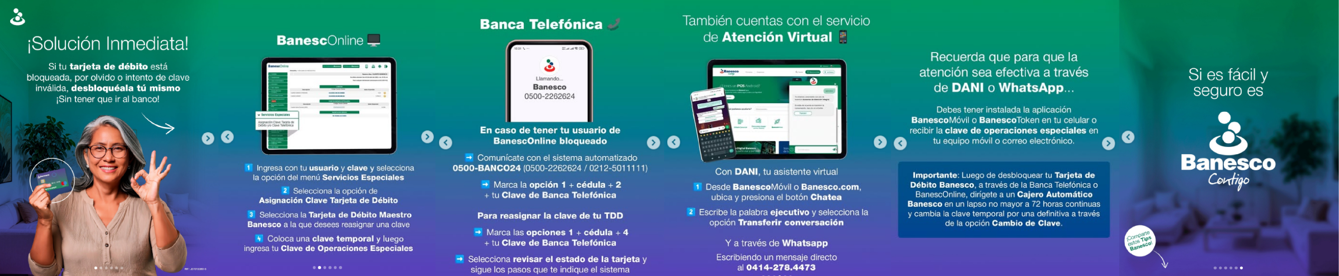 Luego de desbloquear tu Tarjeta de Débito Banesco a través de la Banca Telefónica o #BanescOnline, dirígete a un Cajero Automático Banesco en un lapso no mayor a 72 horas continuas  y cambia la clave temporal por una definitiva a través de la opción "Cambio de Clave".