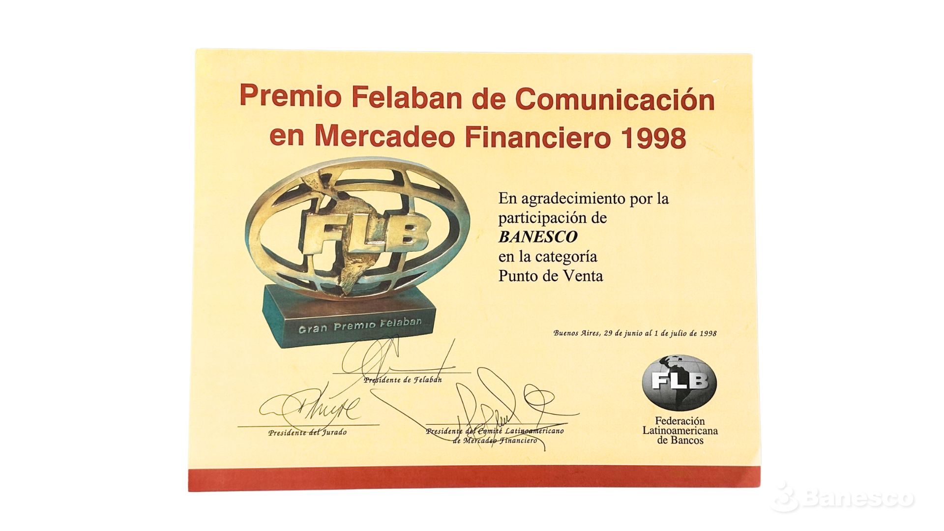 Banesco recibe el premio Felaban de "Comunicación y Mercadeo Financiero 1998" en agradecimiento por su participación en la categoría de Punto de Venta.
