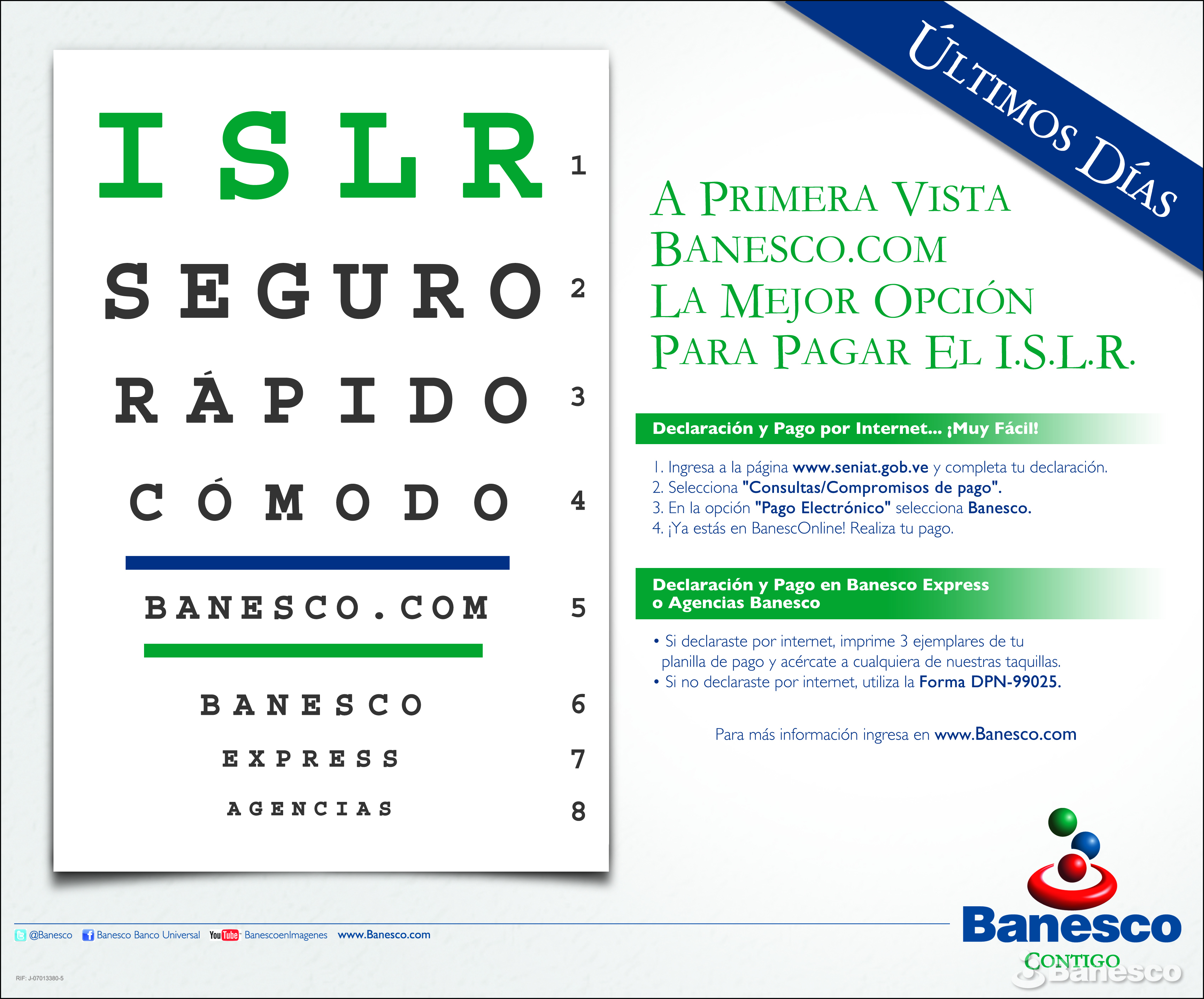 Aviso publicitario acerca del pago del ISLR a través de Banesco.com, de una forma segura, rápida y cómoda.