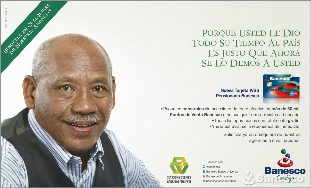 Aviso de prensa, nueva tarjeta IVSS Pensionado Banesco. Para pago sin efectivo en cualquier punto de venta Banesco, operaciones totalmente gratis, reposición inmediata si se extravía. Solicitud en cualquier agencia Banesco.