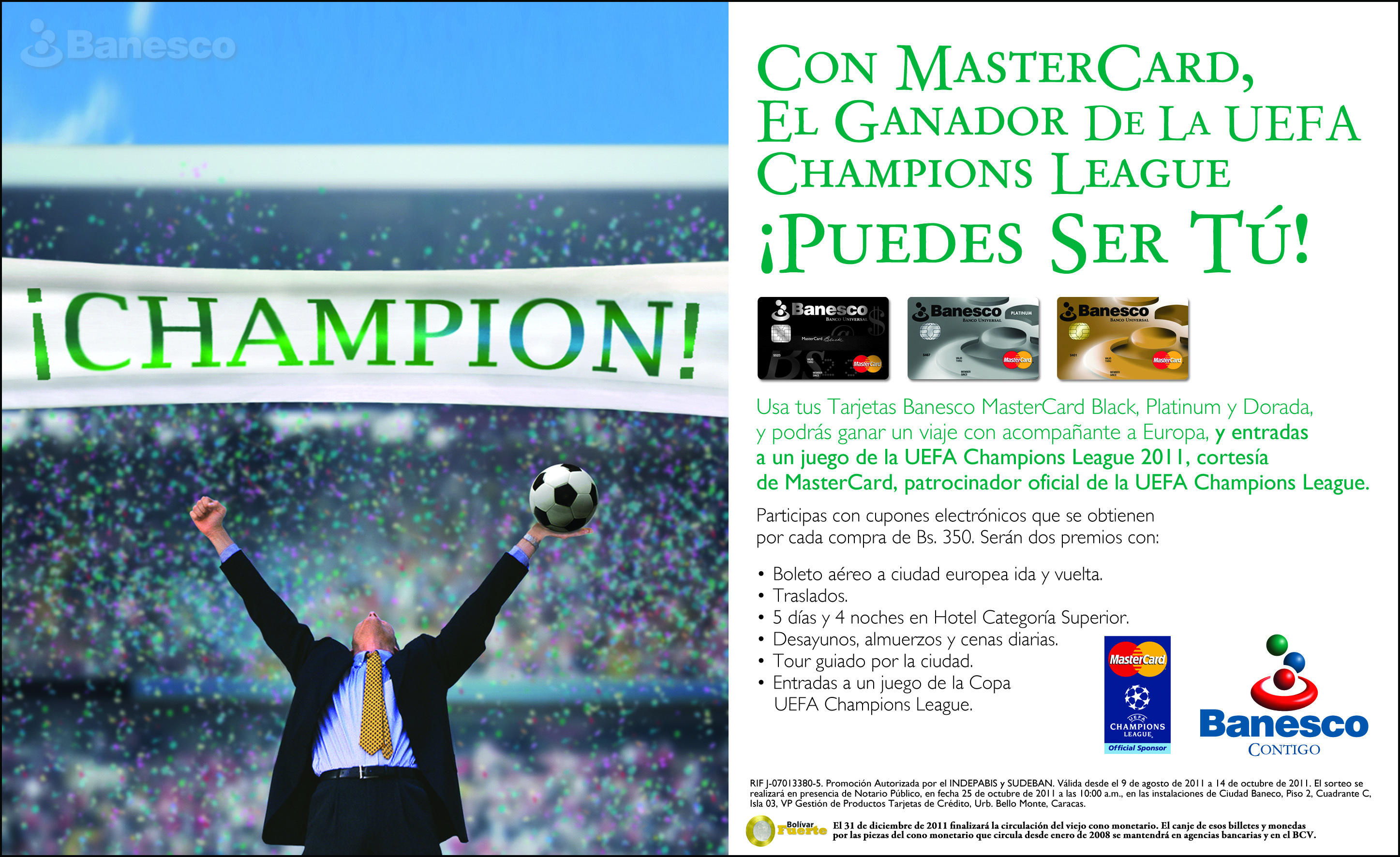 Promoción de Banesco Banco Universal y las tarjetas de crédito MasterCard, en la que podrás ganar un viaje a Europa con un acompañante, además de entradas a un juego de la UEFA Champions League 2011, usando tus tarjetas MasterCard Black, Platinum y Dorada Banesco.