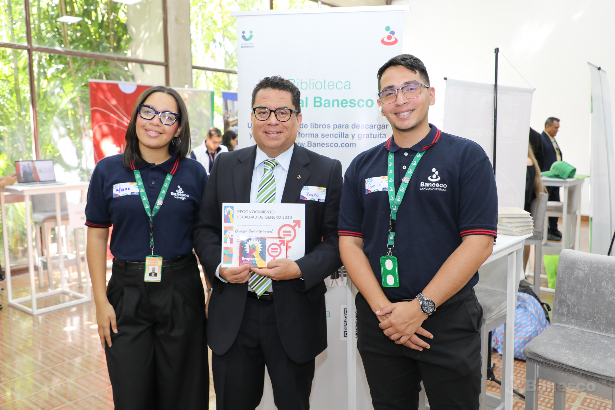 Rubén Ángel, vicepresidente de Capital Humano de Banesco junto a los jóvenes talento Mariángel Añangure y Gabriel González durante el "VI Foro de Sostenibilidad de la ONU Venezuela 2025".