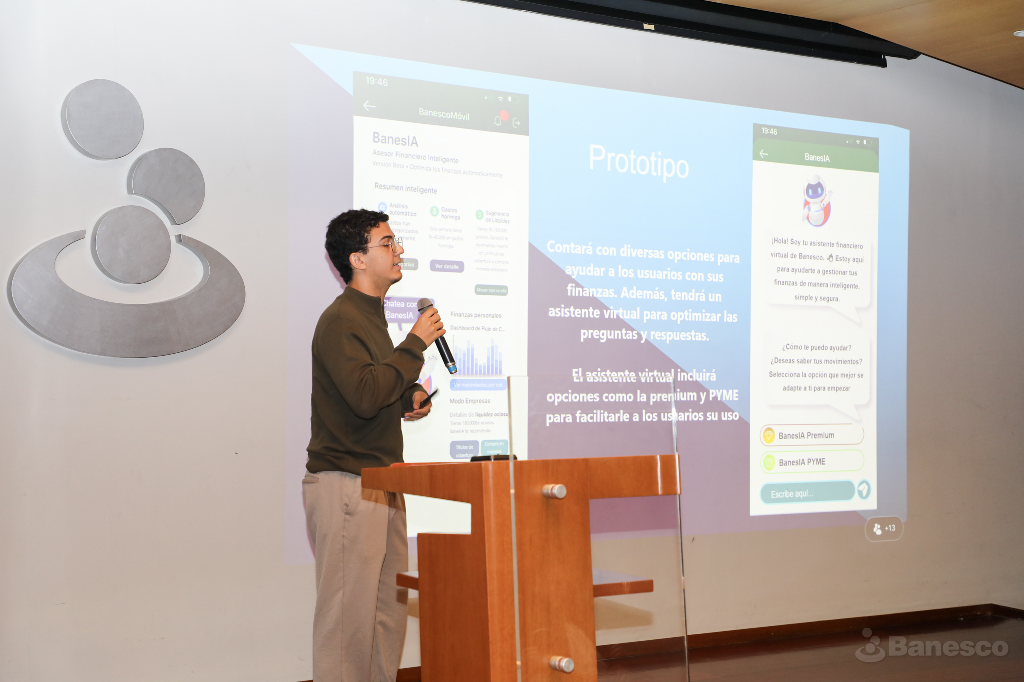 Estudiante de la Universidad Católica Andrés Bello (UCAB) presentando su propuesta "BanesiA" (Asesor financiero inteligente) en la cuarta edición de BanescoInnova UCAB 2026.