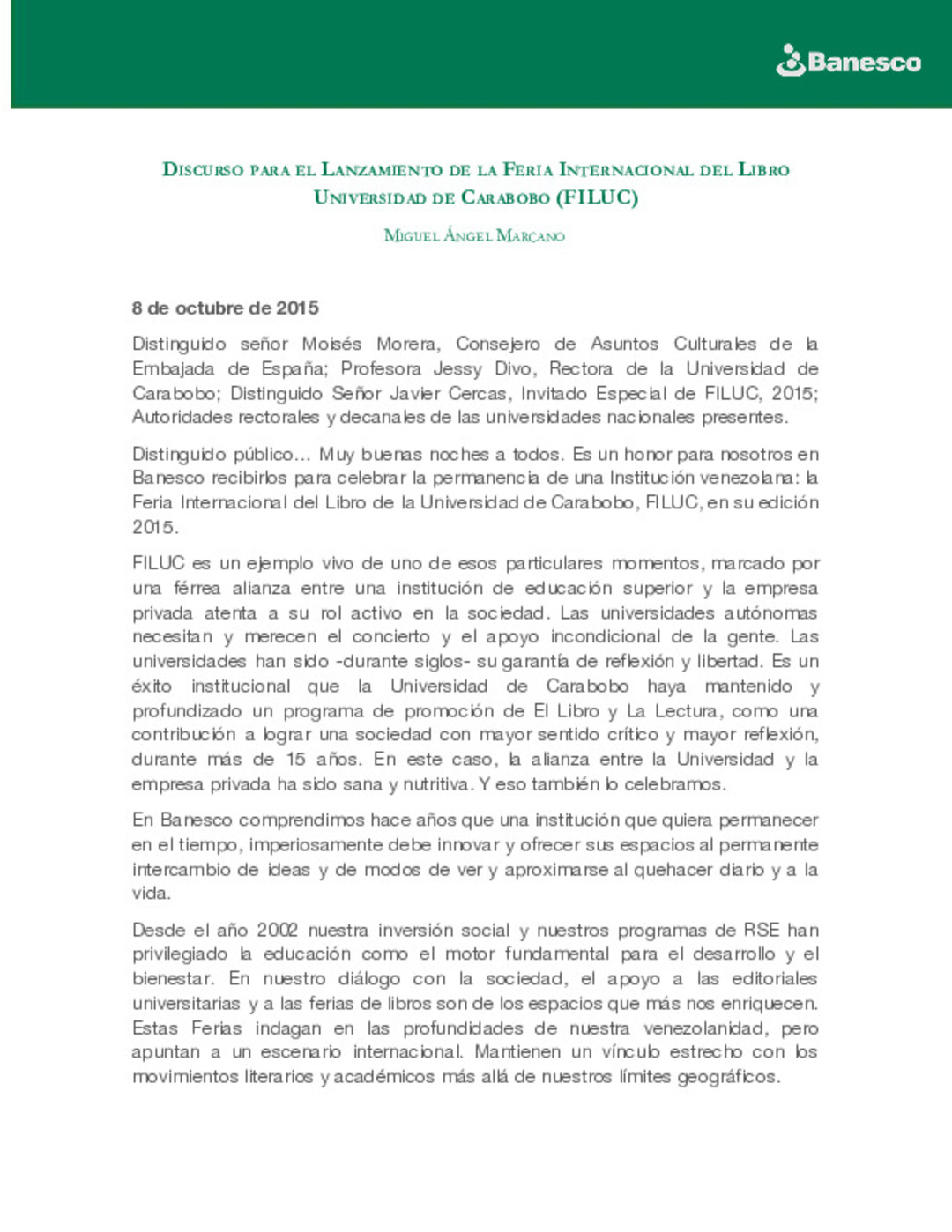 Discurso de Miguel Ángel Marcano por el lanzamiento de la Feria internacional del Libro de la Universidad de Carabobo (FILUC), para el año 2015.