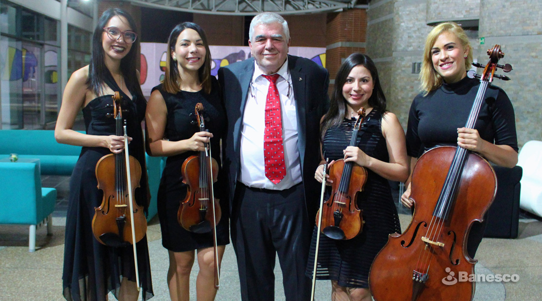 José Grasso Vecchio junto al cuarteto Alma Quarter, durante el bautizo del libro "Rasgos comunes: Antología de poesía venezolana del siglo XX".
