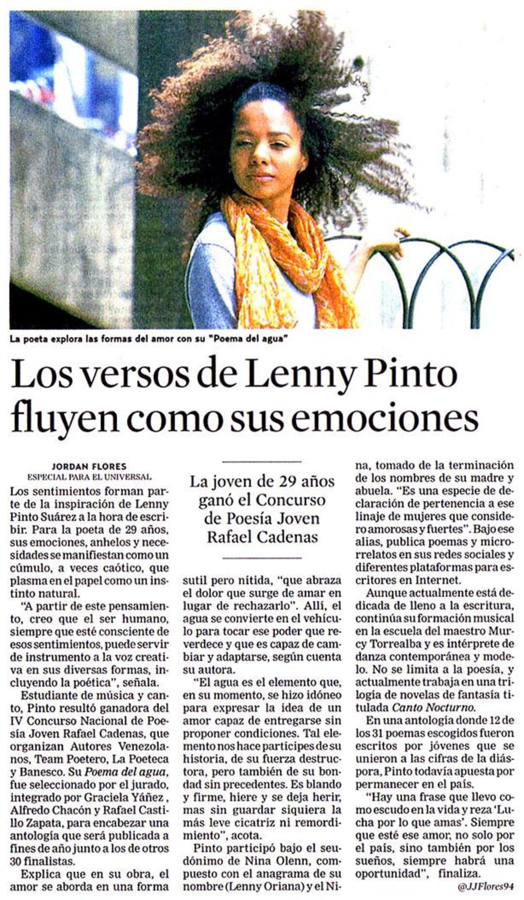 Los sentimientos forman parte de la inspiración de Lenny Pinto Suárez a la hora de escribir. Para la poeta de 29 años, sus emociones, anhelos y necesidades se manifiestan como un cúmulo, a veces caótico, que plasma en el papel como un instinto natural.