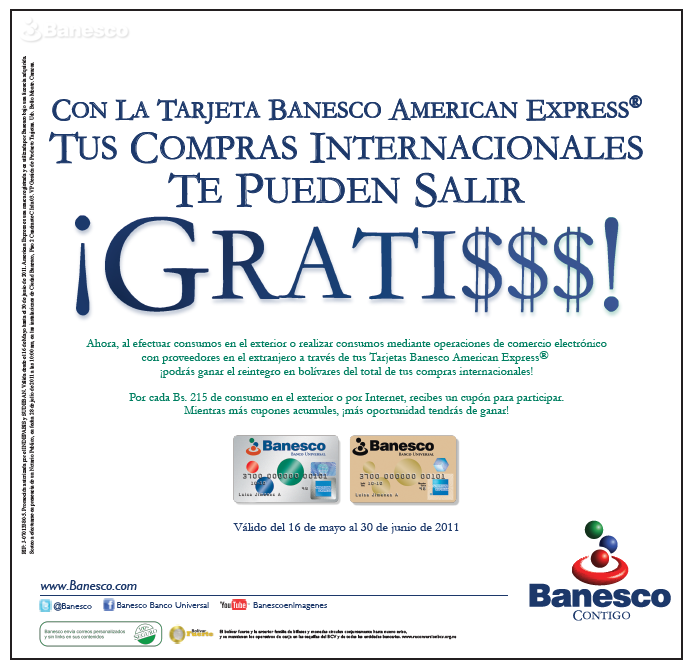 Promoción de la tarjeta de crédito American Express de Banesco Banco Universal, que consiste en que por cada consumo de 215 bolívares, desde el 16 de mayo al 30 de junio de 2011, participas por el reintegro en bolívares del total de tus compras.