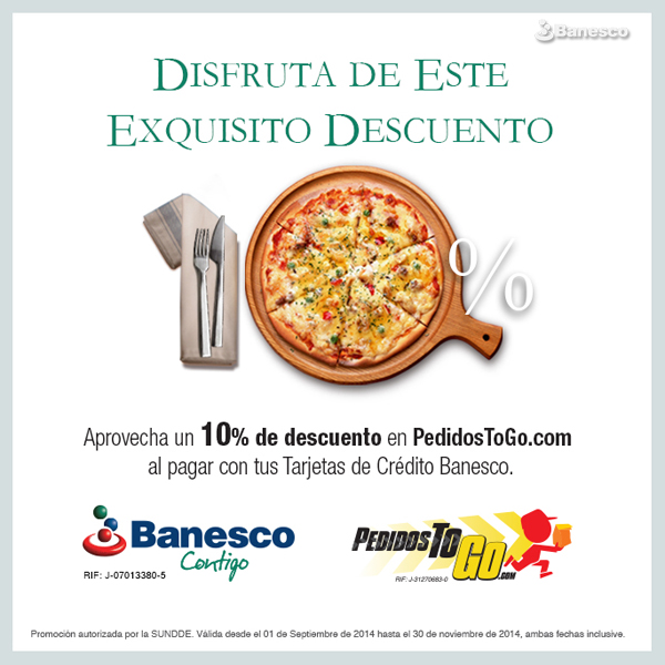 Alianza Banesco y PedidosToGo con promoción de descuento al pagar con tarjetas de crédito Banesco.