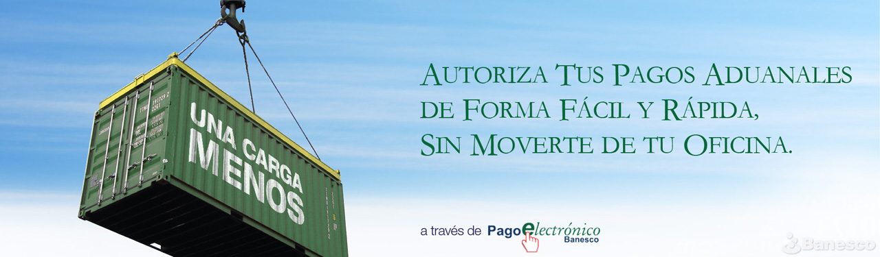 Cintillo publicitario de PagoElectrónico Banesco:'' Autoriza tus pagos aduanales de forma fácil y rápida, sin moverte de tu oficina''.