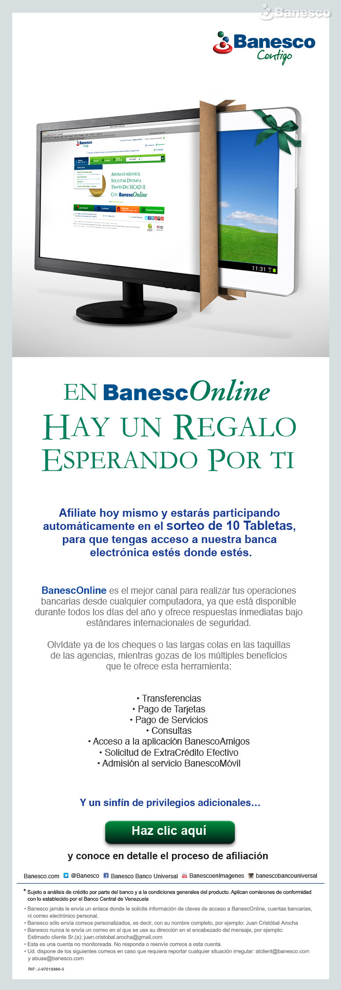 Imagen publicitaria de la Banca Electrónica Banesco promoviendo el uso de la BanescOnline para participar por un sorteo de 10 tabletas.
