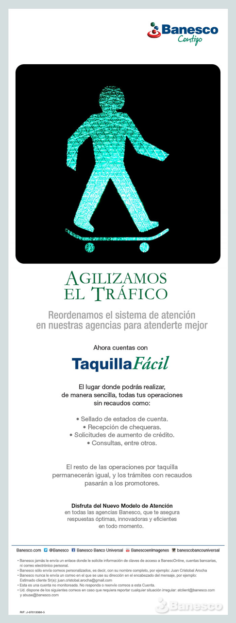 Imagen publicitaria acerca del servicio ofrecido en las Agencias Banesco: ''TaquillaFácil, el lugar donde podrás realizar, de manera sencilla, todas tus operaciones sin recaudos...''