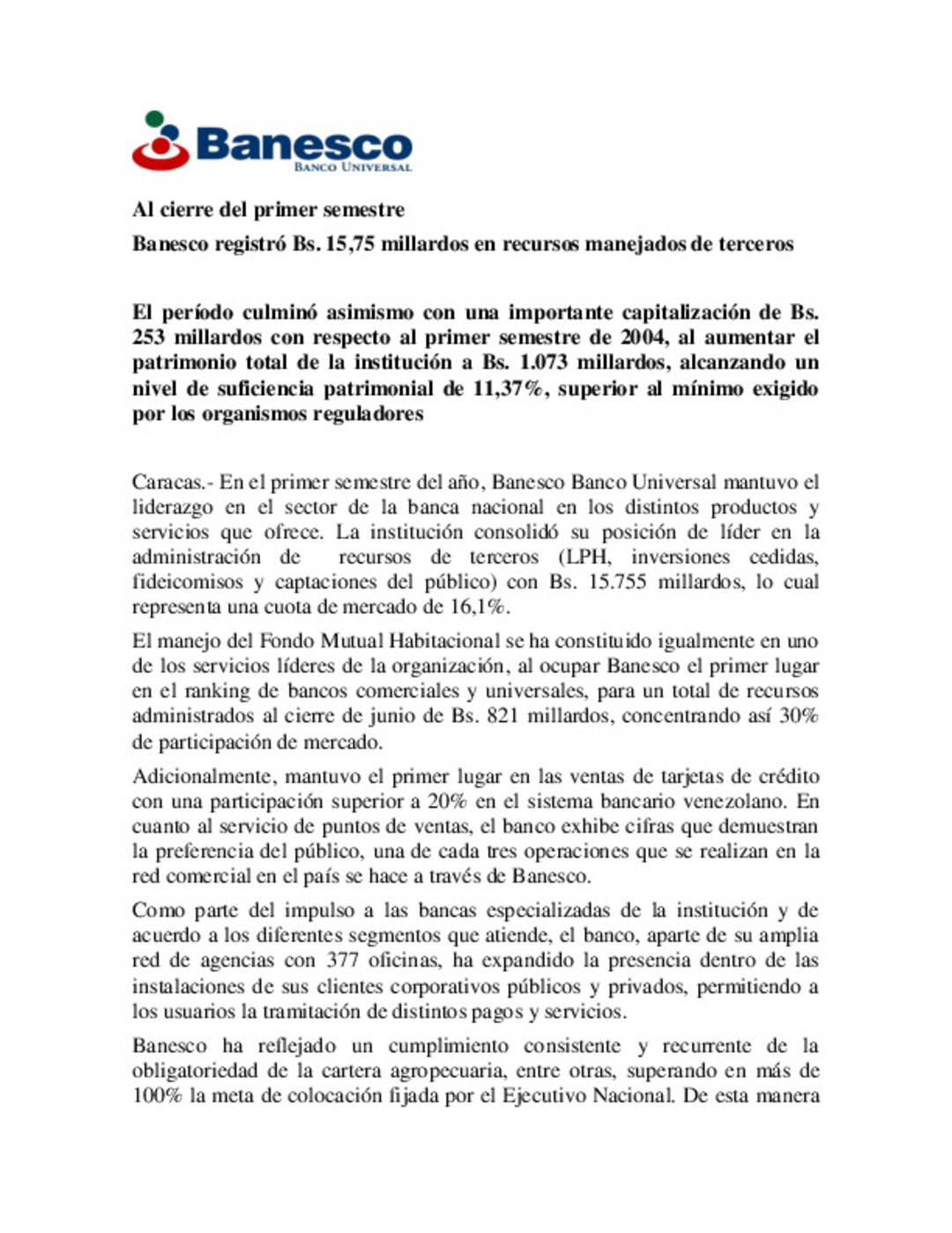 El período culminó asimismo con una importante capitalización de Bs. 253 millardos con respecto al primer semestre de 2004, al aumentar el patrimonio total de la institución a Bs. 1.073 millardos, alcanzando un nivel de suficiencia patrimonial de 11,37%, superior al mínimo exigido por los organismos reguladores.