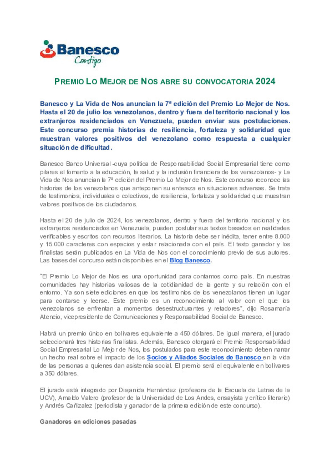 Banesco y La Vida de Nos anuncian la 7ª edición del Premio Lo Mejor de Nos. Hasta el 20 de julio, los venezolanos, dentro y fuera del territorio nacional y los extranjeros residenciados en Venezuela, pueden enviar sus postulaciones. Este concurso premia historias de resiliencia, fortaleza y solidaridad que muestran valores positivos del venezolano como respuesta a cualquier situación de dificultad.