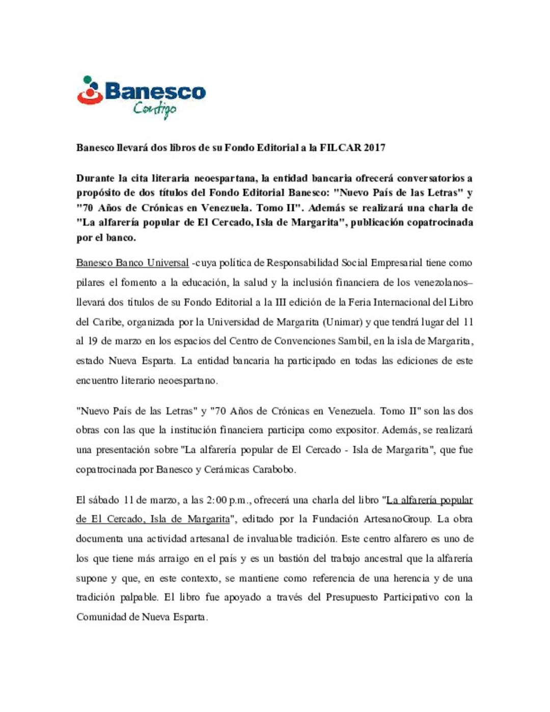 Banesco llevará dos libros de su Fondo Editorial a la FILCAR 2017