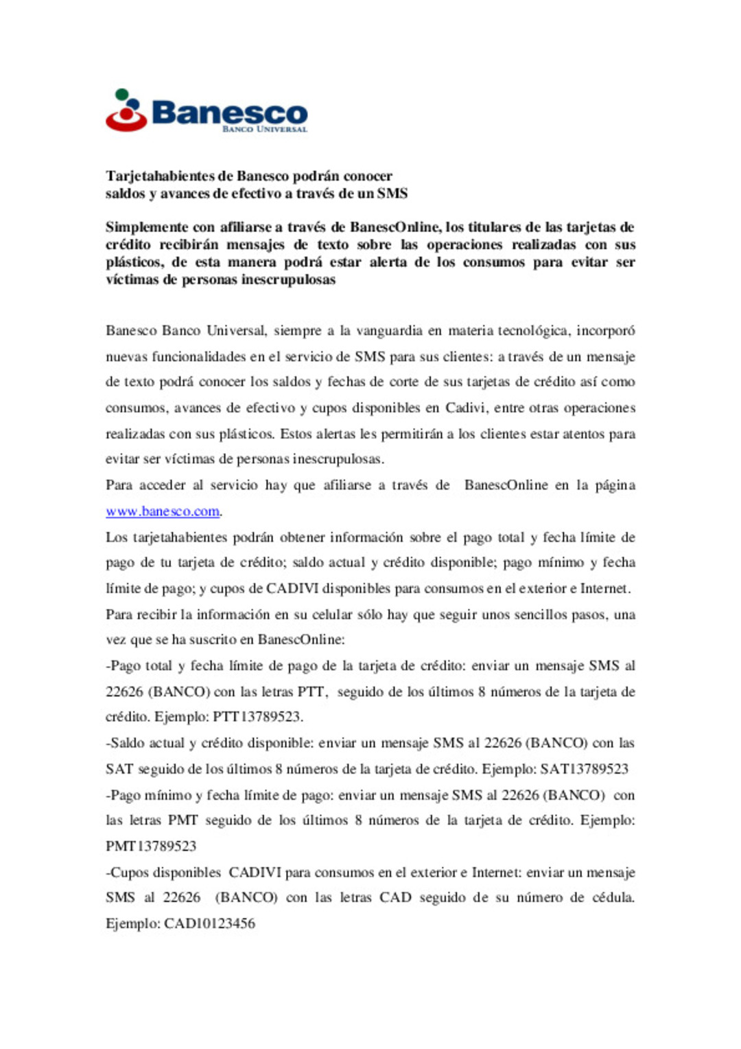 Tarjetahabientes de Banesco podrán conocer saldos y avances de efectivo a través de un SMS