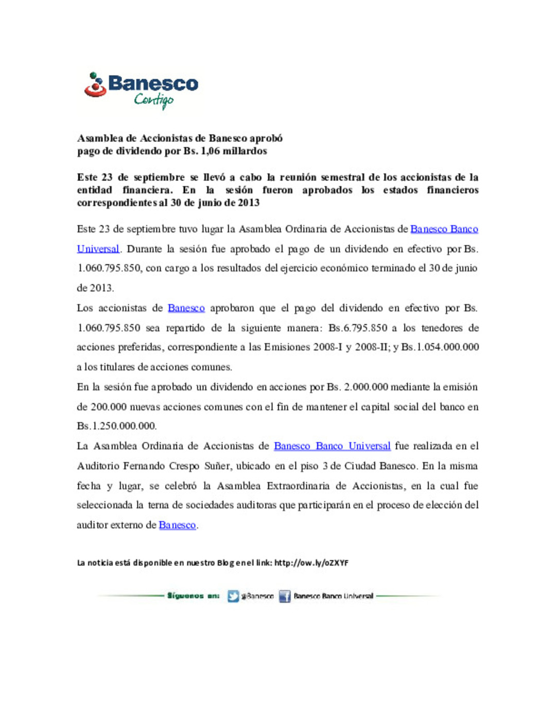 Este 23 de septiembre se llevó a cabo la reunión semestral de los accionistas de la entidad financiera. En la sesión fueron aprobados los estados financieros correspondientes al 30 de junio de 2013.