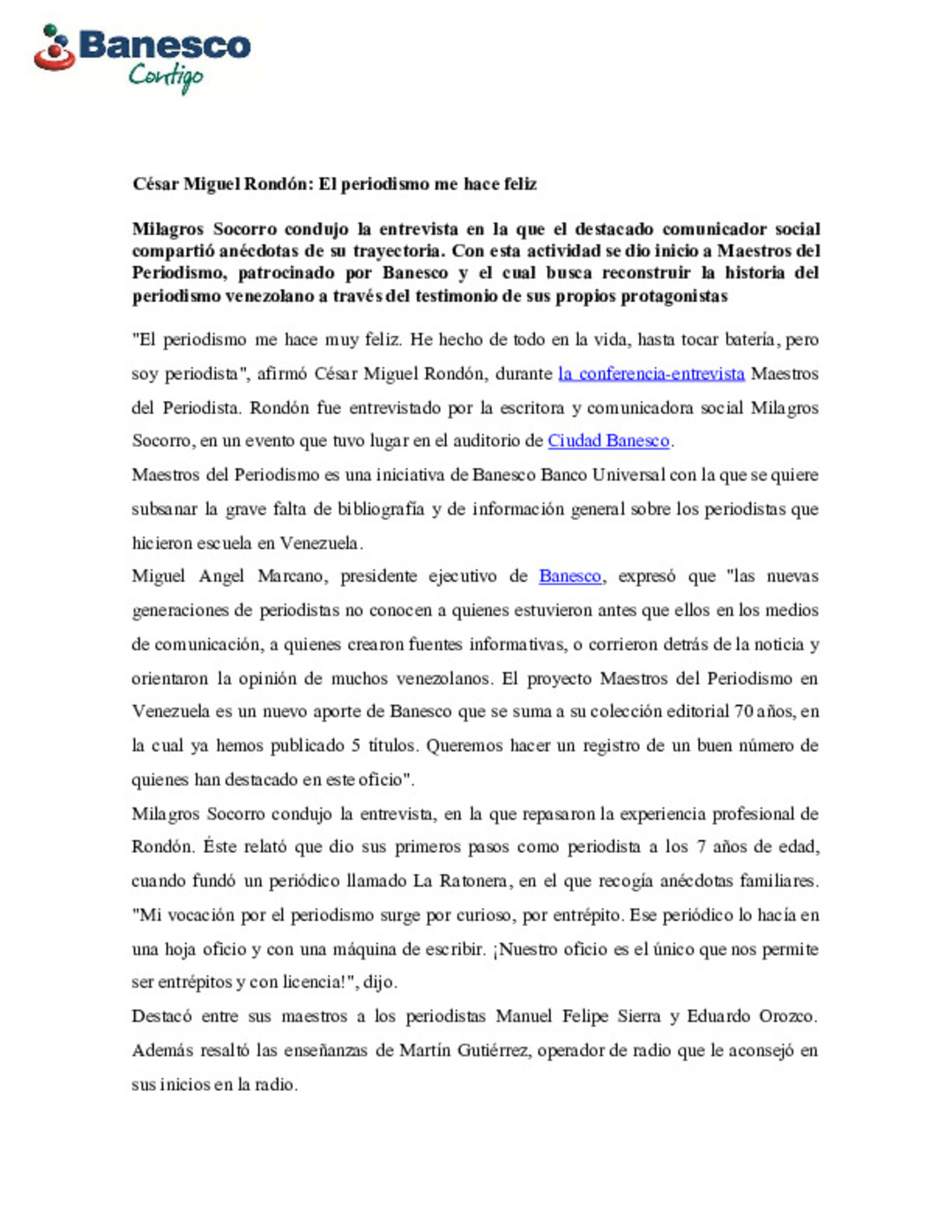 "El periodismo me hace muy feliz. He hecho de todo en la vida, hasta tocar batería, pero soy periodista", afirmó César Miguel Rondón, durante la conferencia-entrevista Maestros del Periodista. Rondón fue entrevistado por la escritora y comunicadora social Milagros Socorro, en un evento que tuvo lugar en el auditorio de Ciudad Banesco.