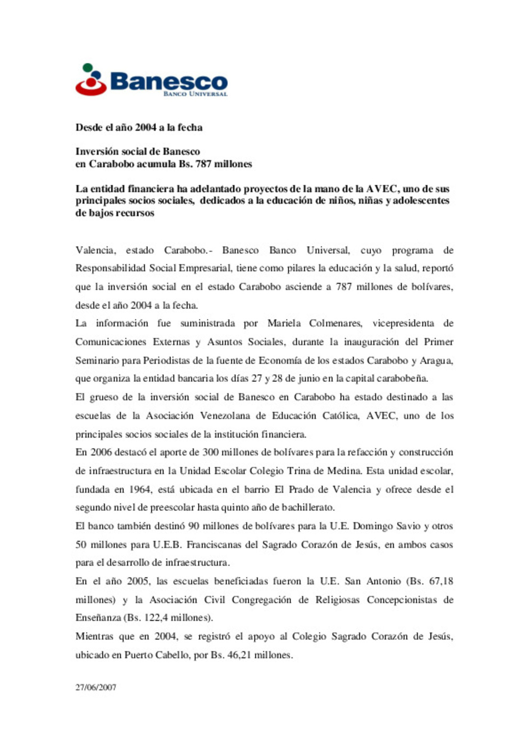 Desde el año 2004 a la fecha: Inversión social de Banesco en Carabobo acumula Bs. 787 millones
