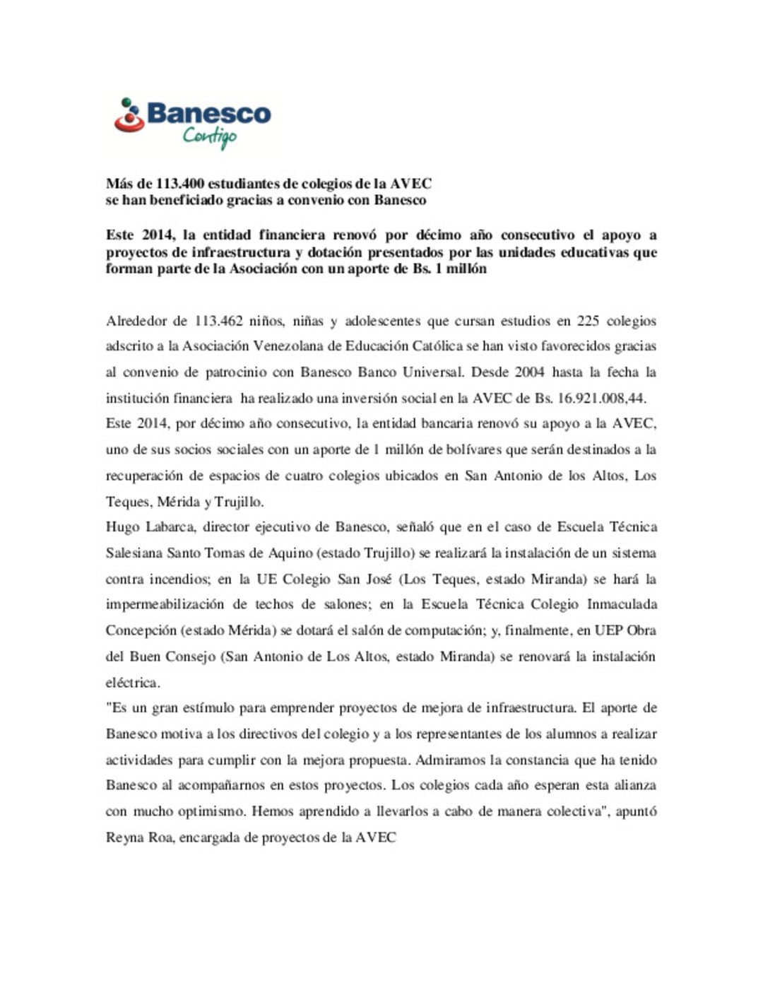 Más de 113.400 estudiantes de colegios de la AVEC se han beneficiado gracias a convenio con Banesco