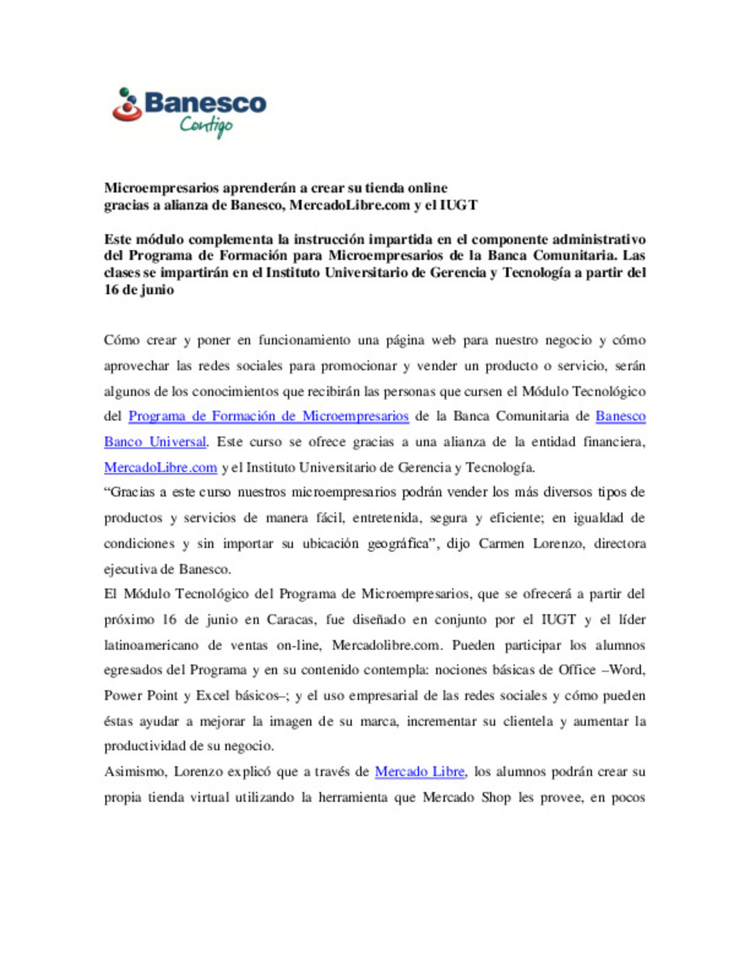 Microempresarios aprenderán a crear su tienda online gracias a alianza de Banesco, MercadoLibre.com y el IUGT
