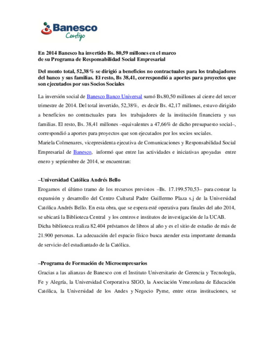 En 2014 Banesco ha invertido Bs. 80,59 millones en el marco de su Programa de Responsabilidad Social Empresarial