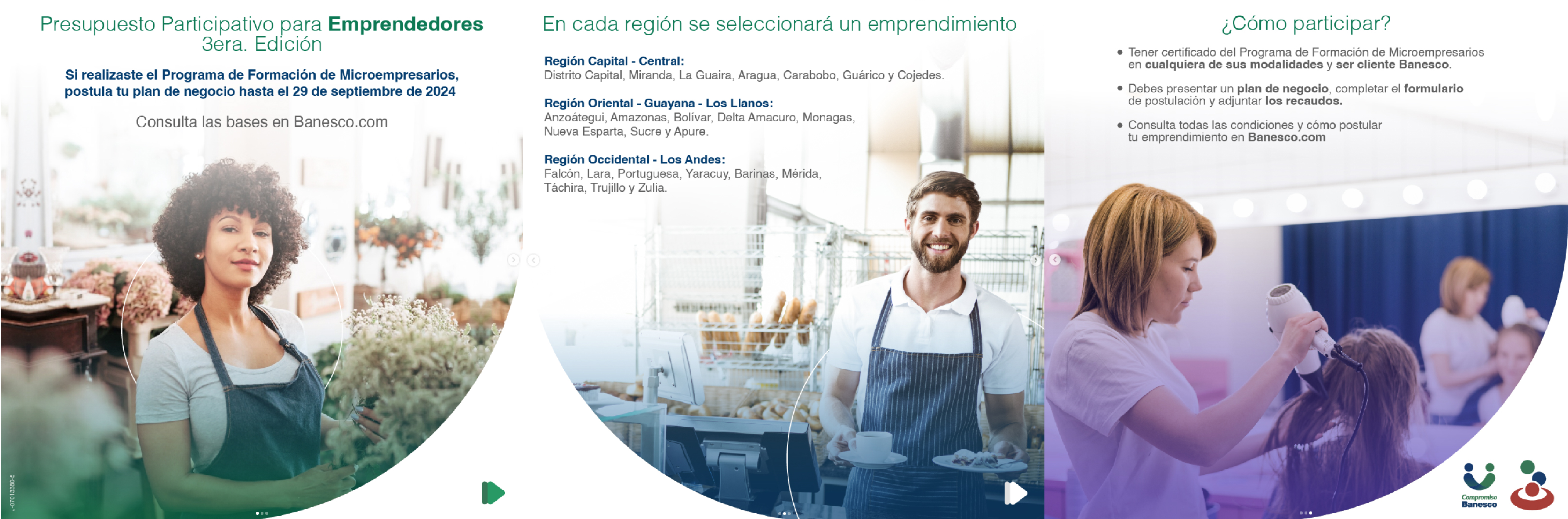 Las personas certificadas en el Programa de Formación de Microempresarios #Banesco pueden postular su plan de negocio y optar por un capital semilla de Bs. 128.000,00 no reembolsables. La convocatoria estará abierta hasta el 29 de septiembre de 2024.