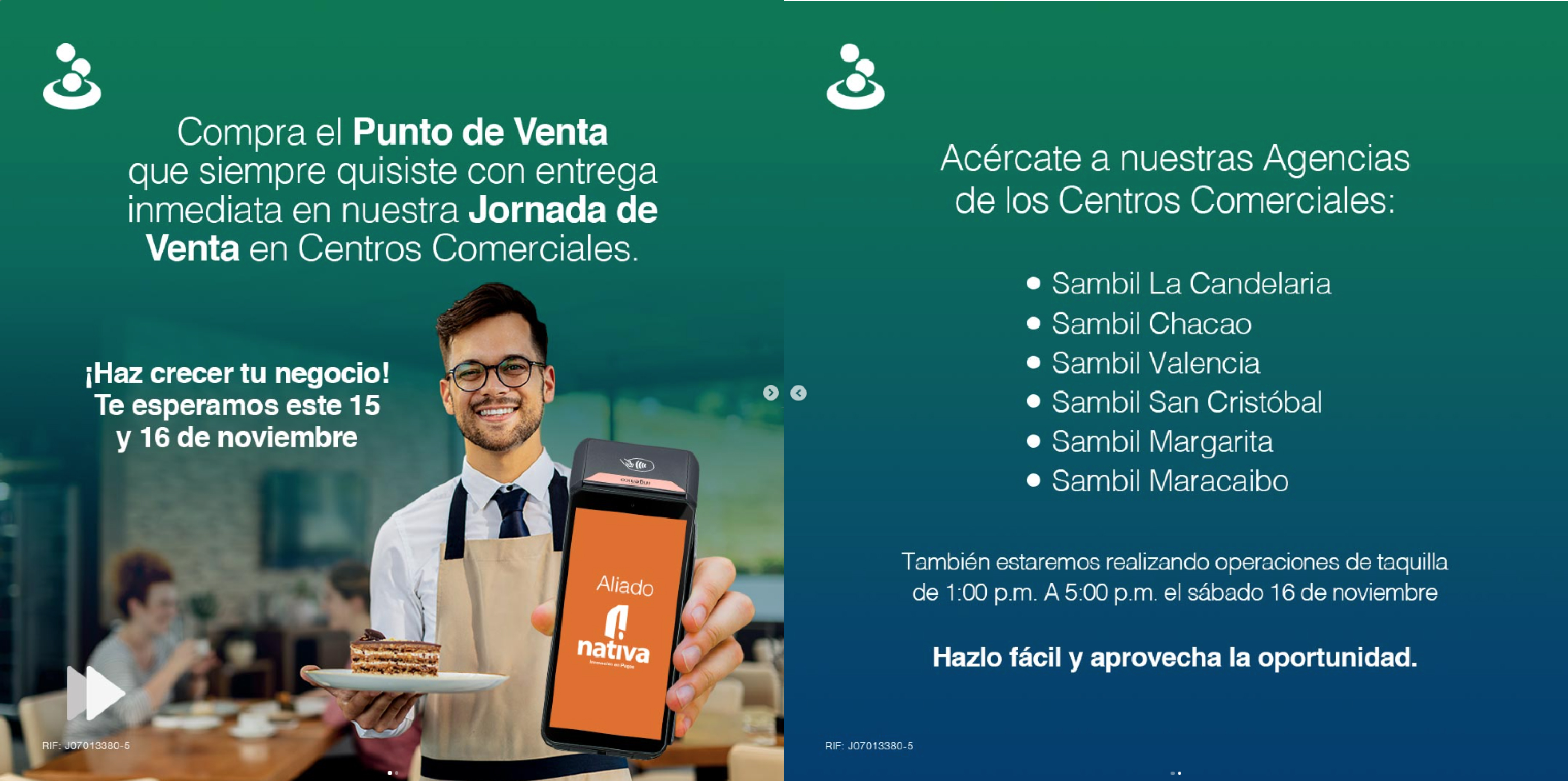 Junto a nuestro aliado @nativapagos conoce la variedad de Puntos de Venta con el mejor precio y con entrega inmediata. El sábado la atención en las agencias ubicadas en los Centros Comerciales Sambil, será de 01:00 p.m. a 5:00 p.m. Durante este horario también podrás realizar tus operaciones de taquilla.