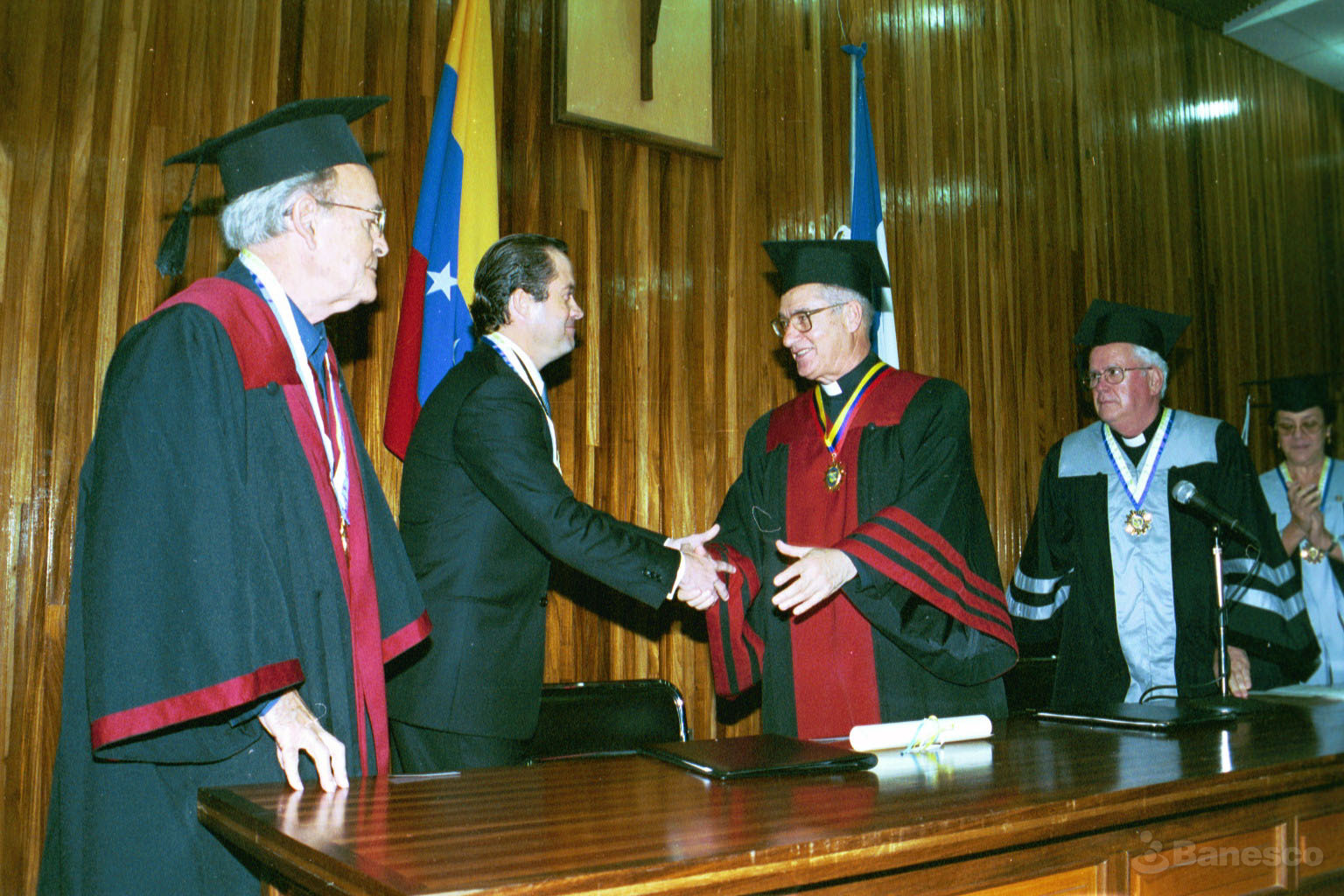 Juan Carlos Escotet y Luis Ugalde estrechan manos posterior a la imposición de la "Orden de Honor" otorgada a Banesco, por su contribución al fortalecimiento institucional de la Asociación Venezolana de Educación Católica (AVEC).