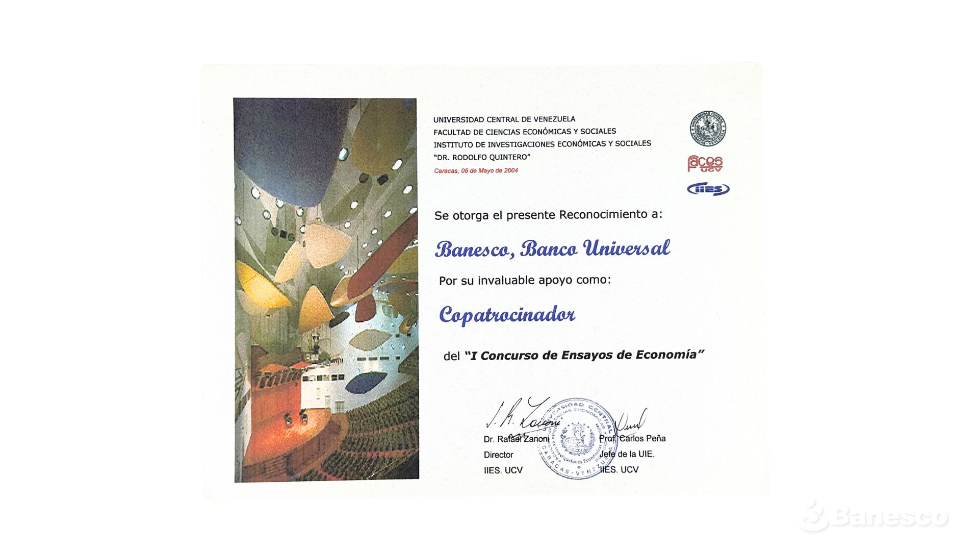 La Universidad Central de Venezuela le otorga el reconocimiento a Banesco por su invaluable apoyo como copatrocinador del "I Concurso de Ensayos de Economía".