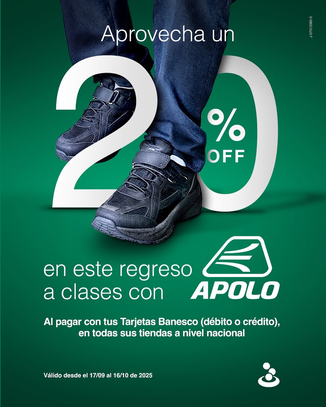 Si aún te faltan los zapatos de tus chamos para completar este inicio de clases, aprovecha el 20 % de descuento que te ofrece @apoloshoes al pagar con tus tarjetas Banesco (débito y crédito). Válido desde el 17 de septiembre al 16 de octubre de 2025, en todas las tiendas a nivel nacional. El descuento no aplica en mercancía con descuento. ¡No espere más! Acércate a la tienda #ApoloShoes más cercana y dale a tus hijos el calzado perfecto para un año escolar exitoso.