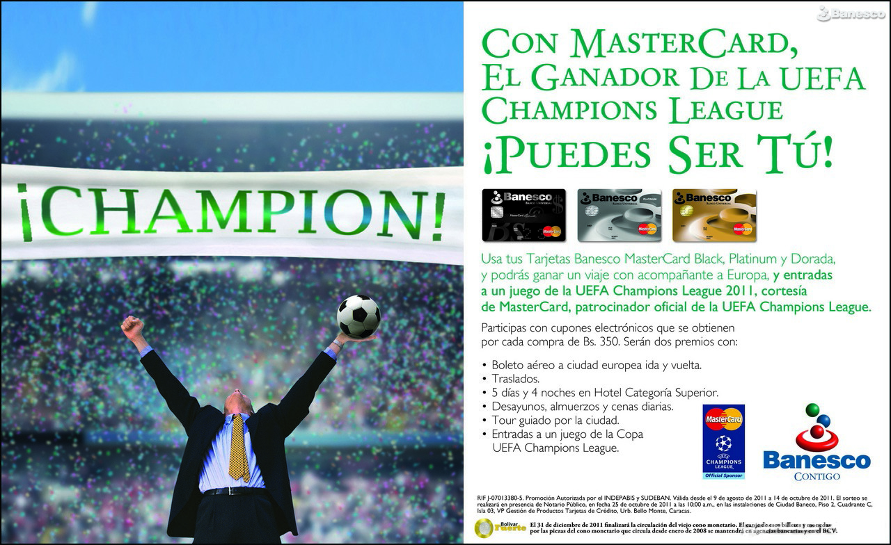 Promoción de Banesco Banco Universal y las tarjetas de crédito MasterCard, en la que podrás ganar un viaje a Europa con un acompañante, además de entradas a un juego de la UEFA Champions League 2011, usando tus tarjetas MasterCard Black, Platinum y Dorada Banesco.